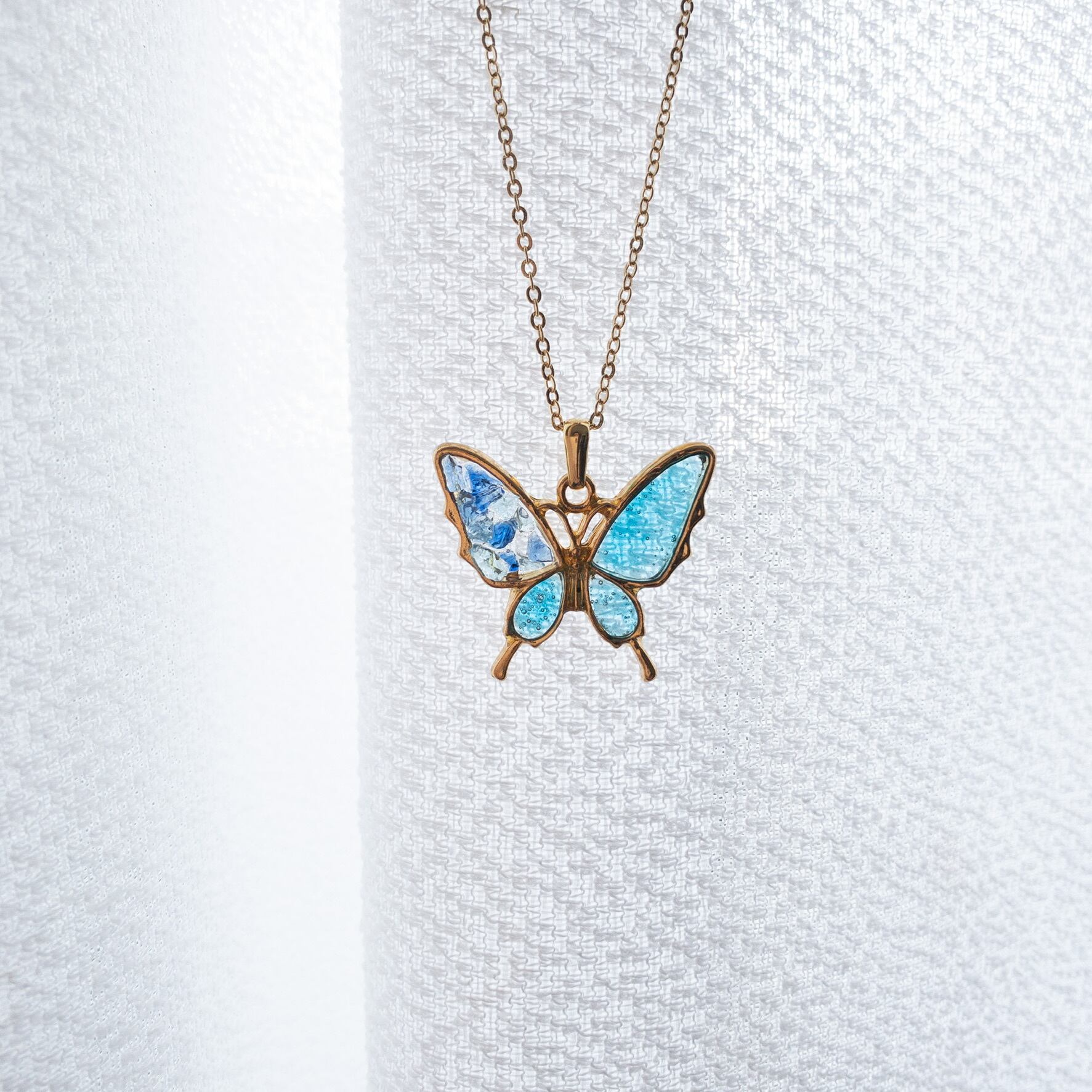 蝶の羽の一部を、極小サイズの琉球ガラスのカケラを使って色付けしています。